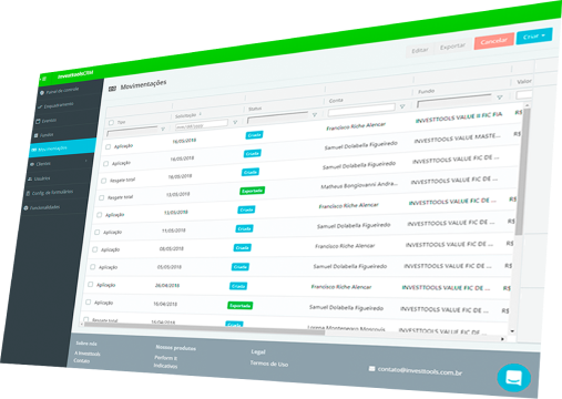 Na vanguarda do desenvolvimento tecnológico, reconhecemos a necessidade de estar, sempre, encontrando dores do mercado e usando o nosso know-how para gerar soluções amplas, adaptadas às necessidades de cada agente do ecossistema financeiro. Do microuniverso das gestoras ao amplo universo das finanças, a Investtools tem como objetivo final transformar o mercado com tecnologia. Nossa qualidade no desenvolvimento de soluções gera satisfação imediata nos clientes, com aprovação de 100% dos nossos produtos e taxa de saída próxima a zero. Nossa motivação está no desafio da inovação constante e da satisfação do cliente. Trabalhamos para nos tornar referência no mercado como uma empresa de destaque na área de tecnologia e de excelência na área financeira.